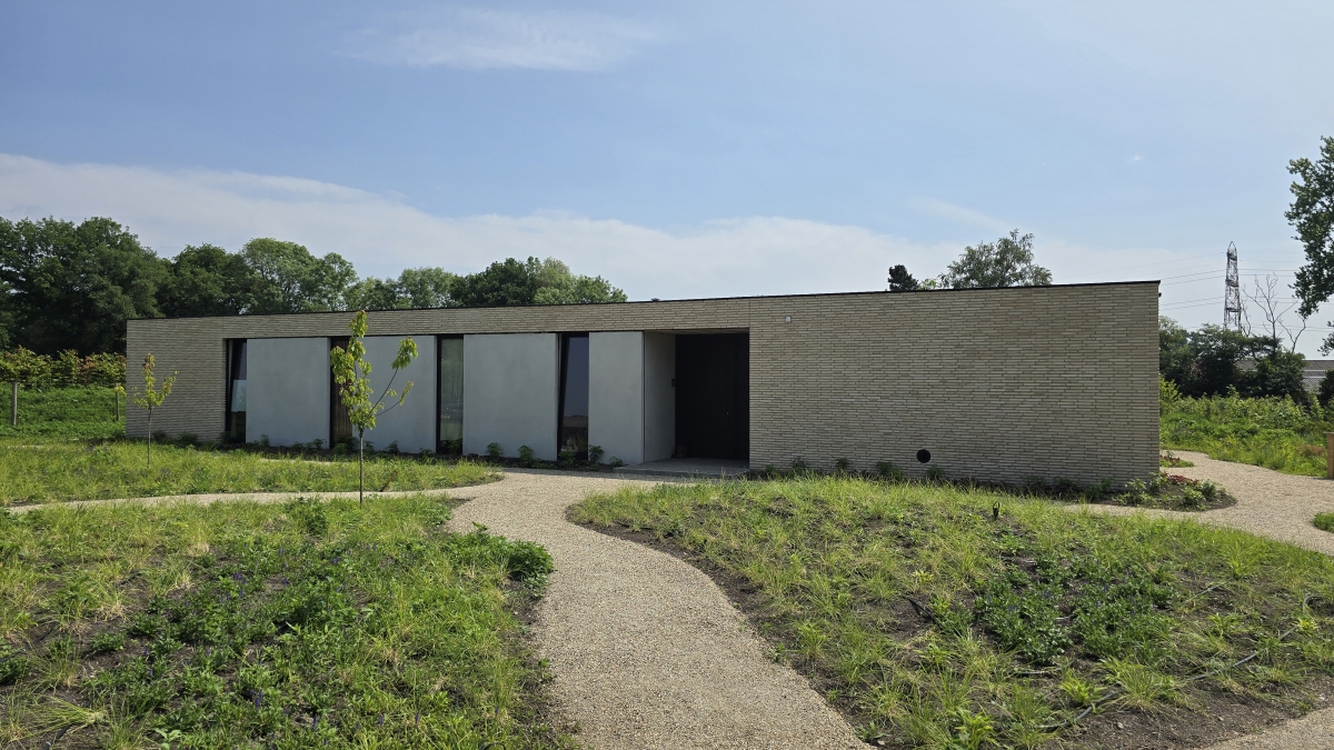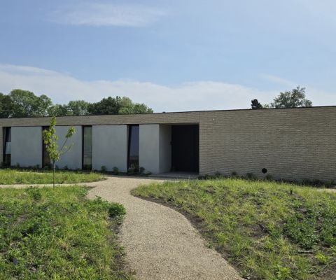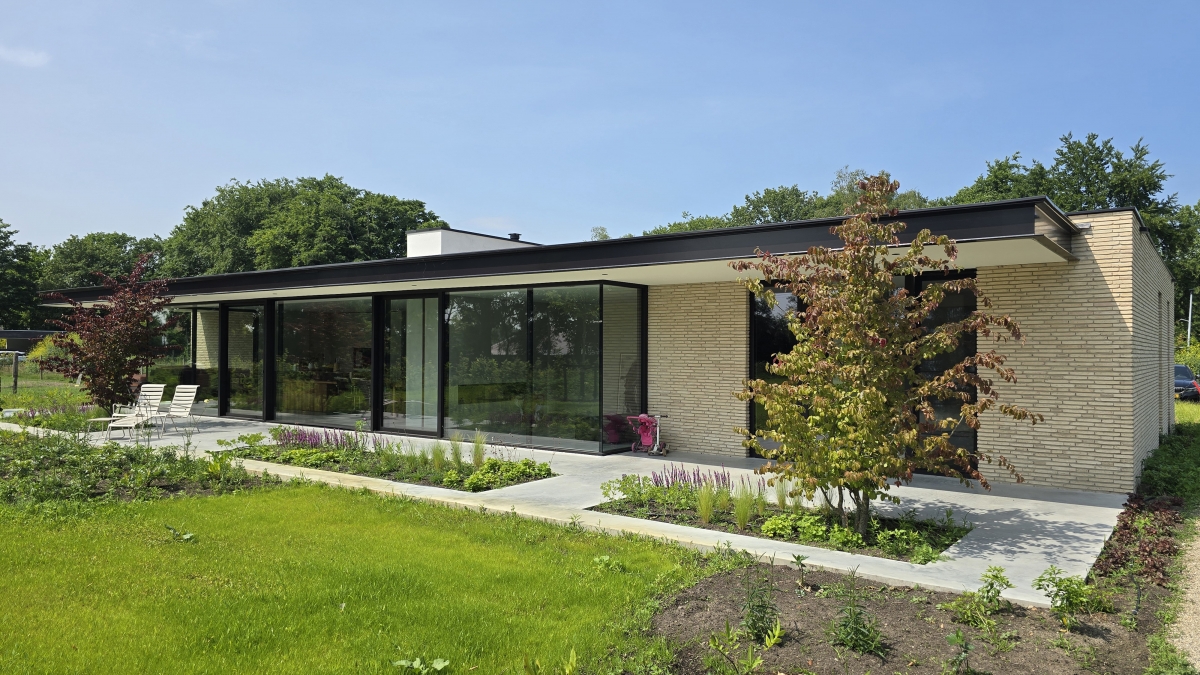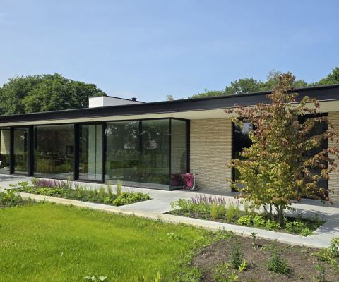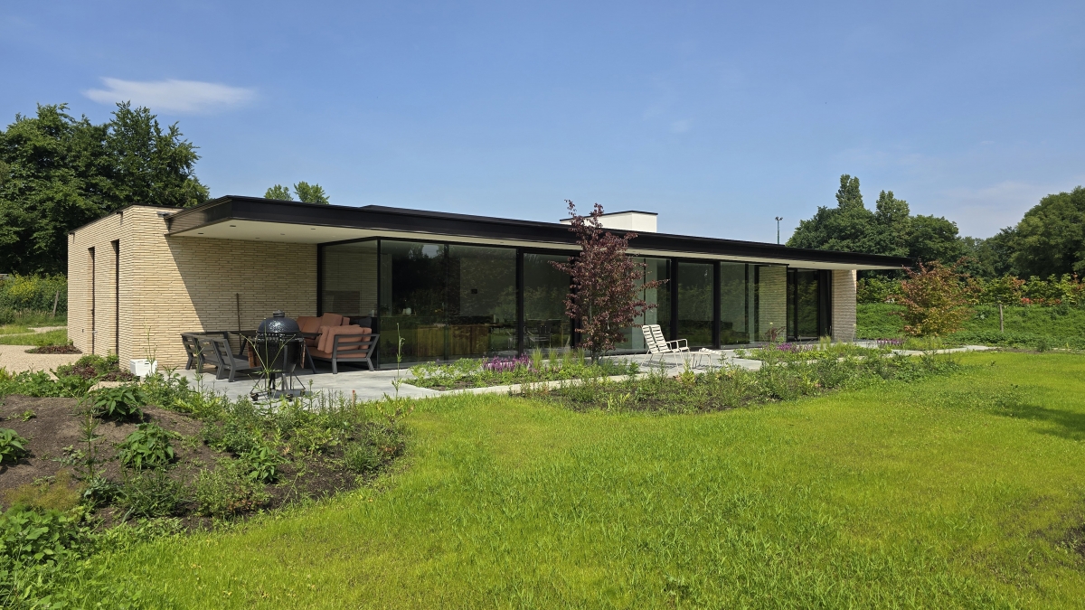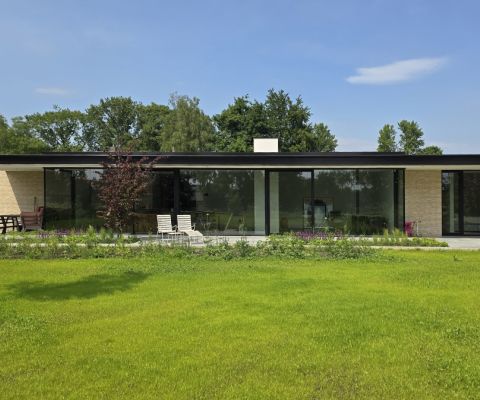 Een moderne woning in het buitengebied. De zijde aan de straat is vrij gesloten, de verdiepte entree wordt geaccentueerd door een stalen kader. Met grote glazen puien aan de achterzijde wordt veel daglicht in de woning gebracht en is er rondom zicht op de tuin. De materialen metselwerk, beton, metaal en glas geven de woning een moderne, ingetogen uitstraling. Het serene karakter in het interieur is gerealiseerd door toepassing van schoonwerk beton en notenhout.